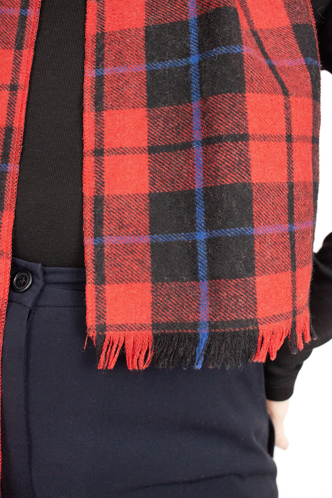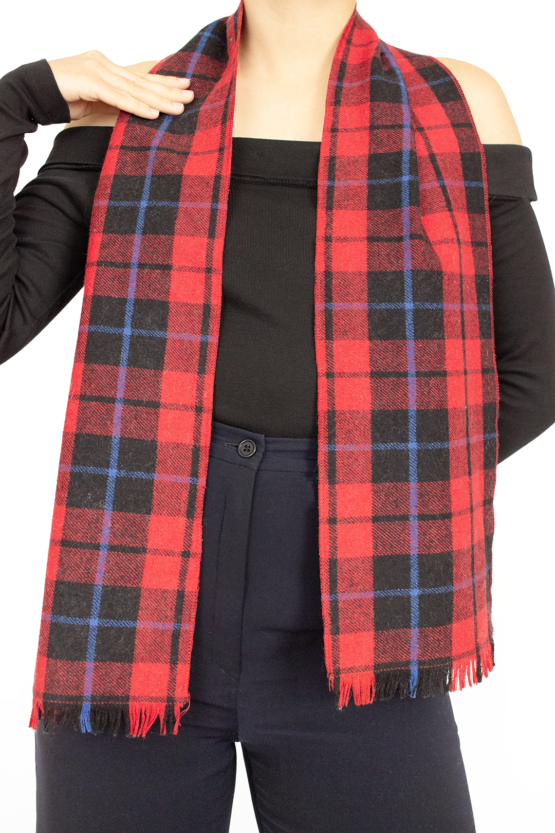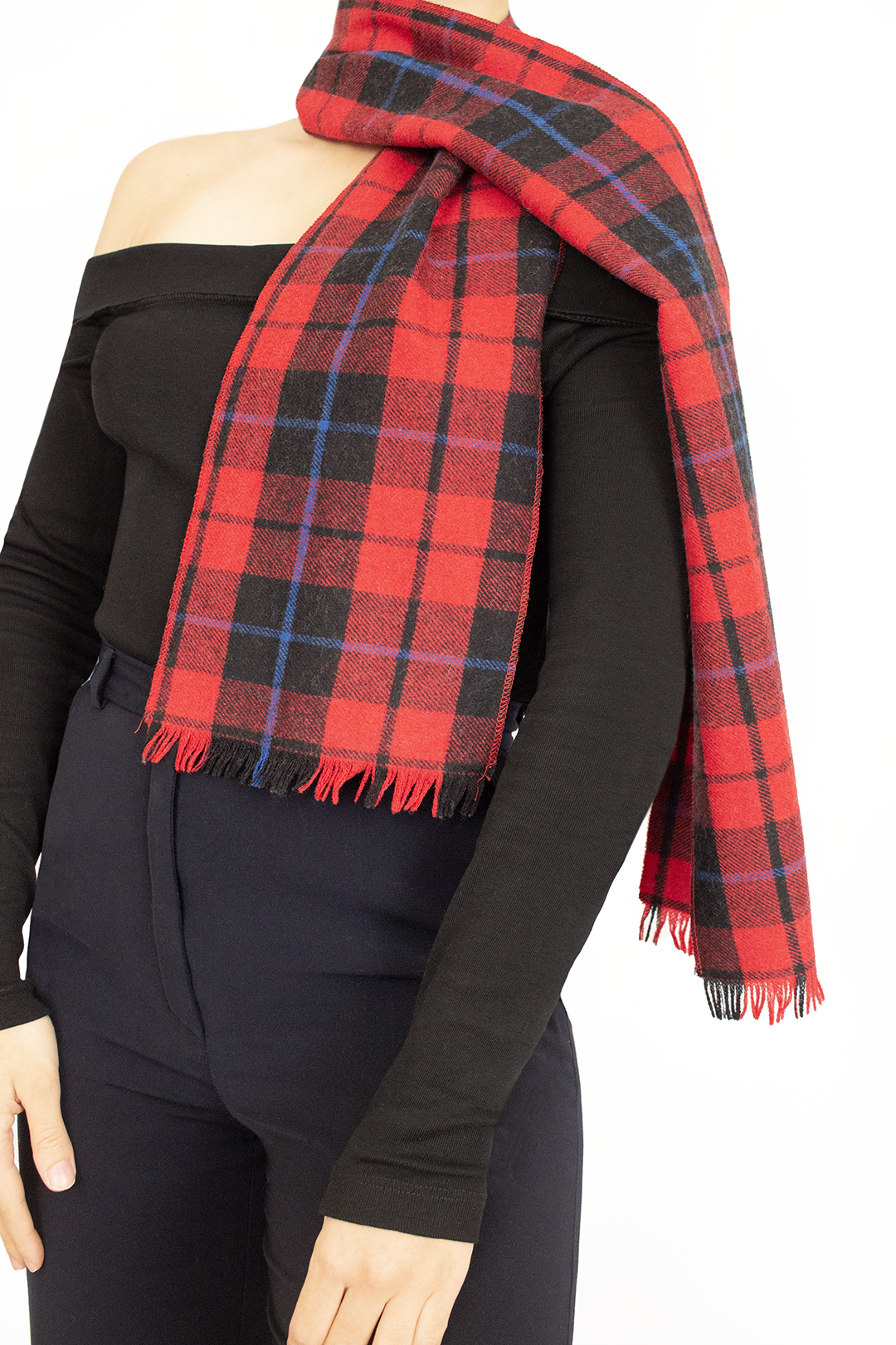 Cachecol vintage com padrão xadrez em vermelho, azul e preto. Modelo mais fino, sem composição mas parece ter lã. Ótimo estado.