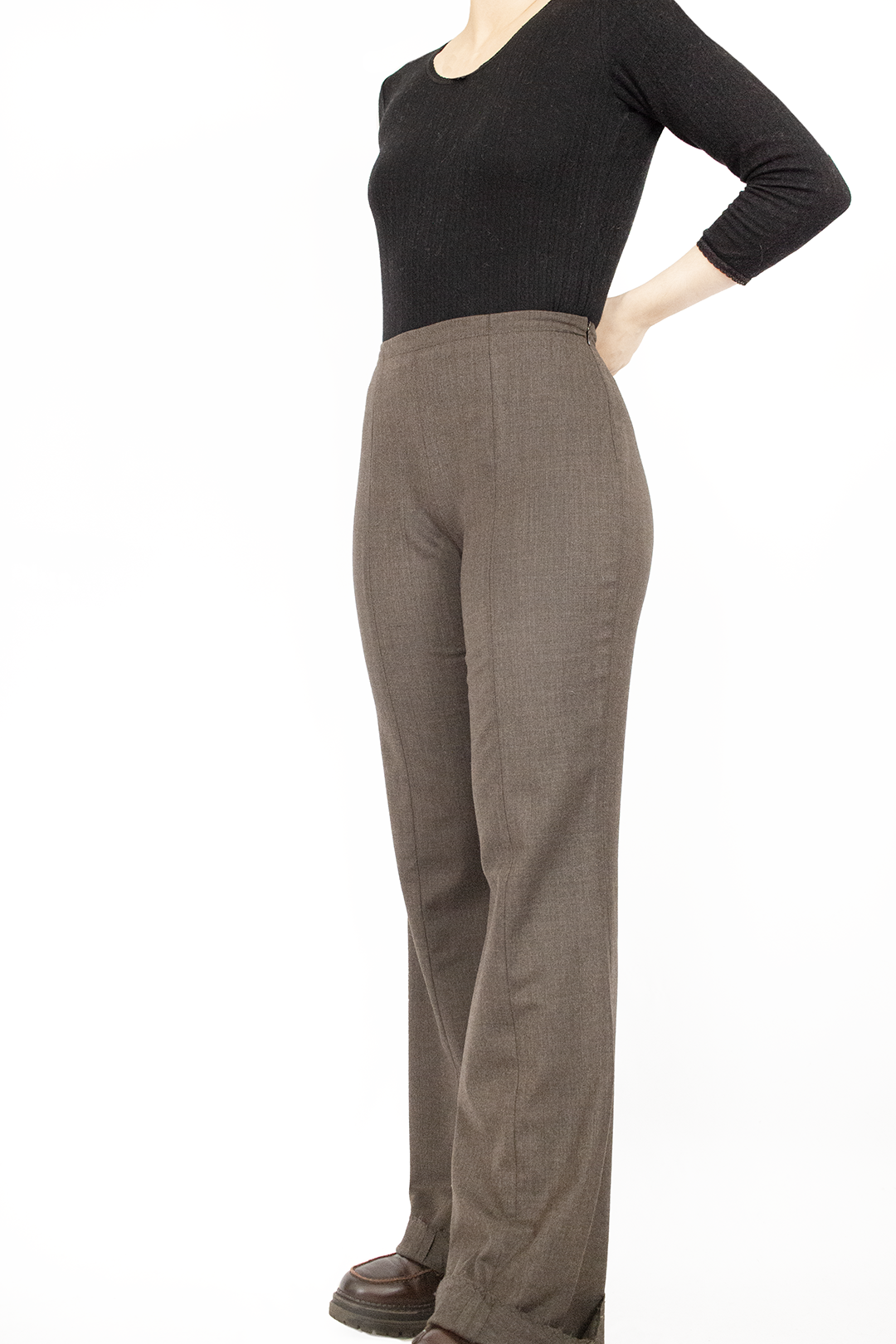 Calças Escada em castanho mesclado. Tecido de fato em lã fina. Indicam tamanho 36, mas vestem 38. Com dobra na bainha pois ficam compridas na modelo. Ótimo estado.