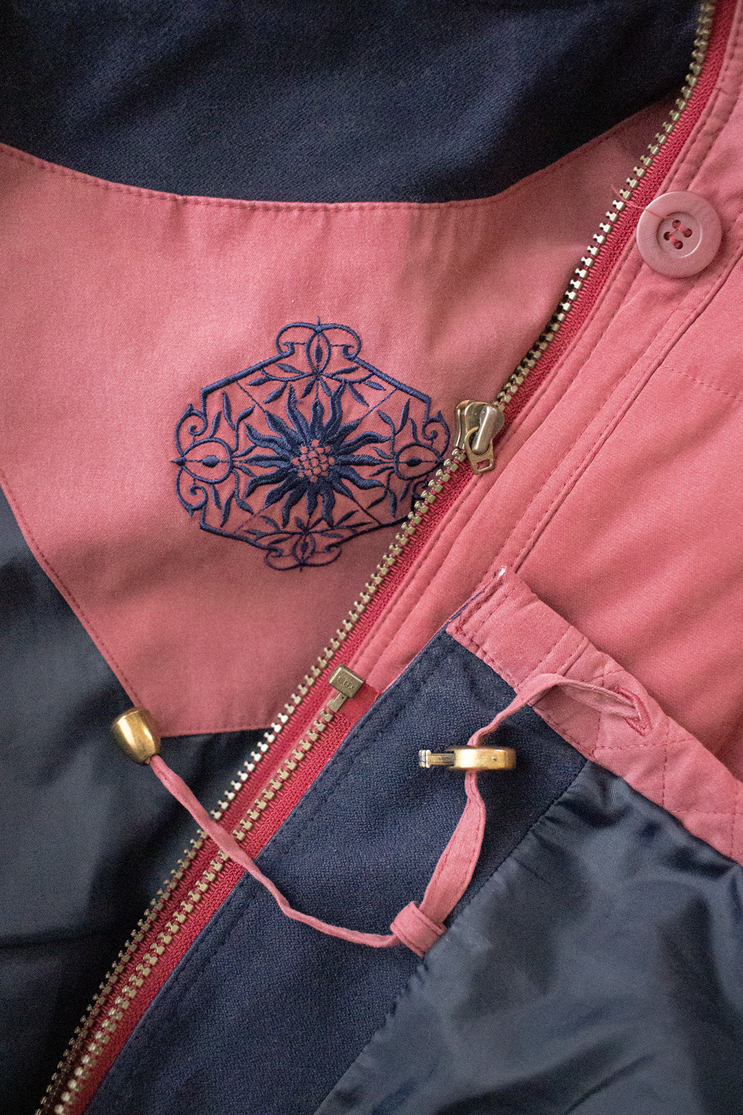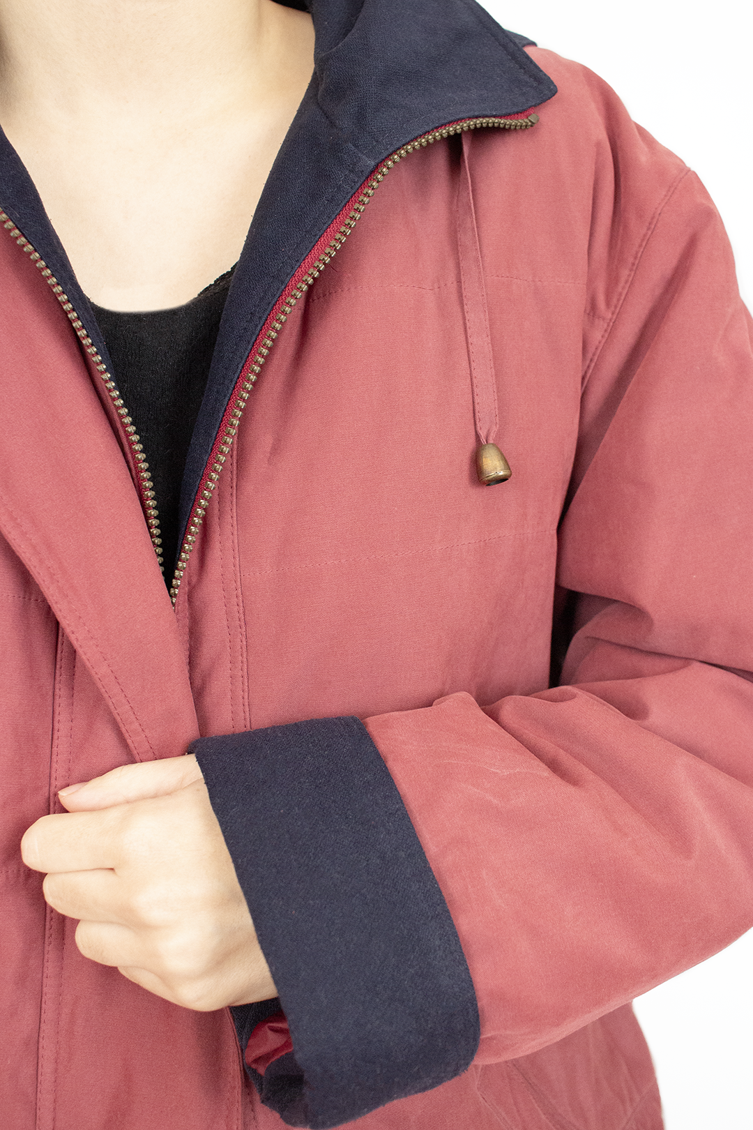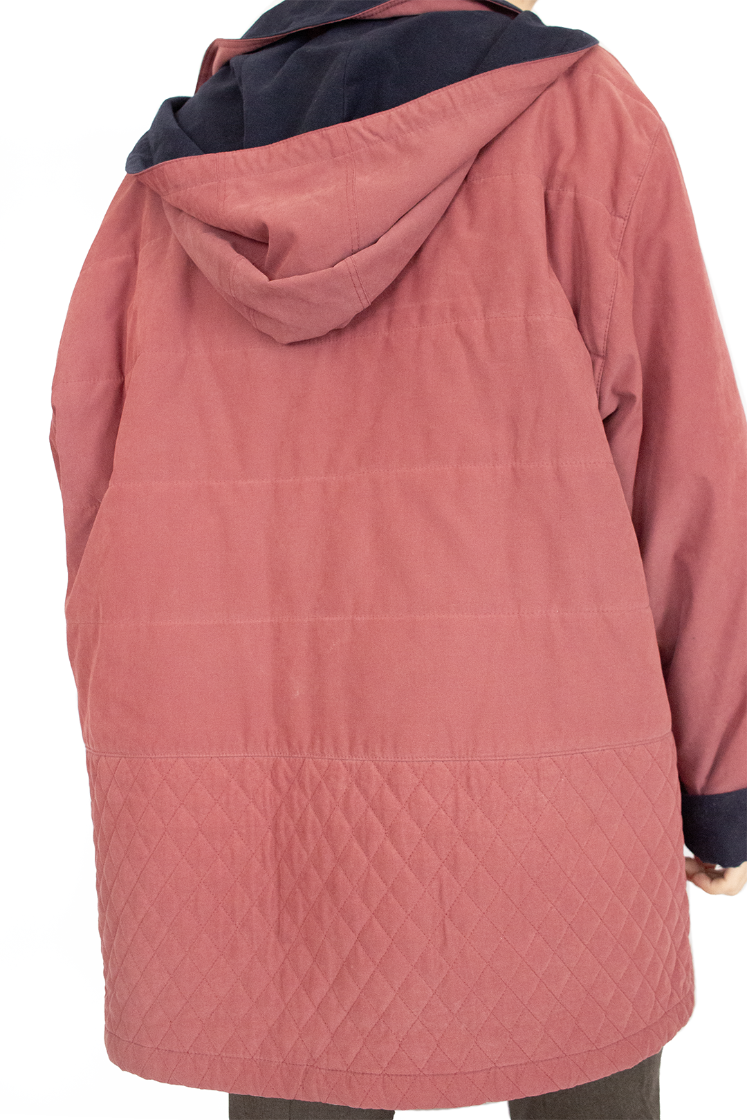 Casaco vintage acolchoado num tom de vermelho apagado/rosado com pormenores em azul escuro. Toque suave. Tem capuz, botões e fecho, bem como cordões para ajustar ao fundo. Tamanho 42 ou mais oversize a tamanhos menores.