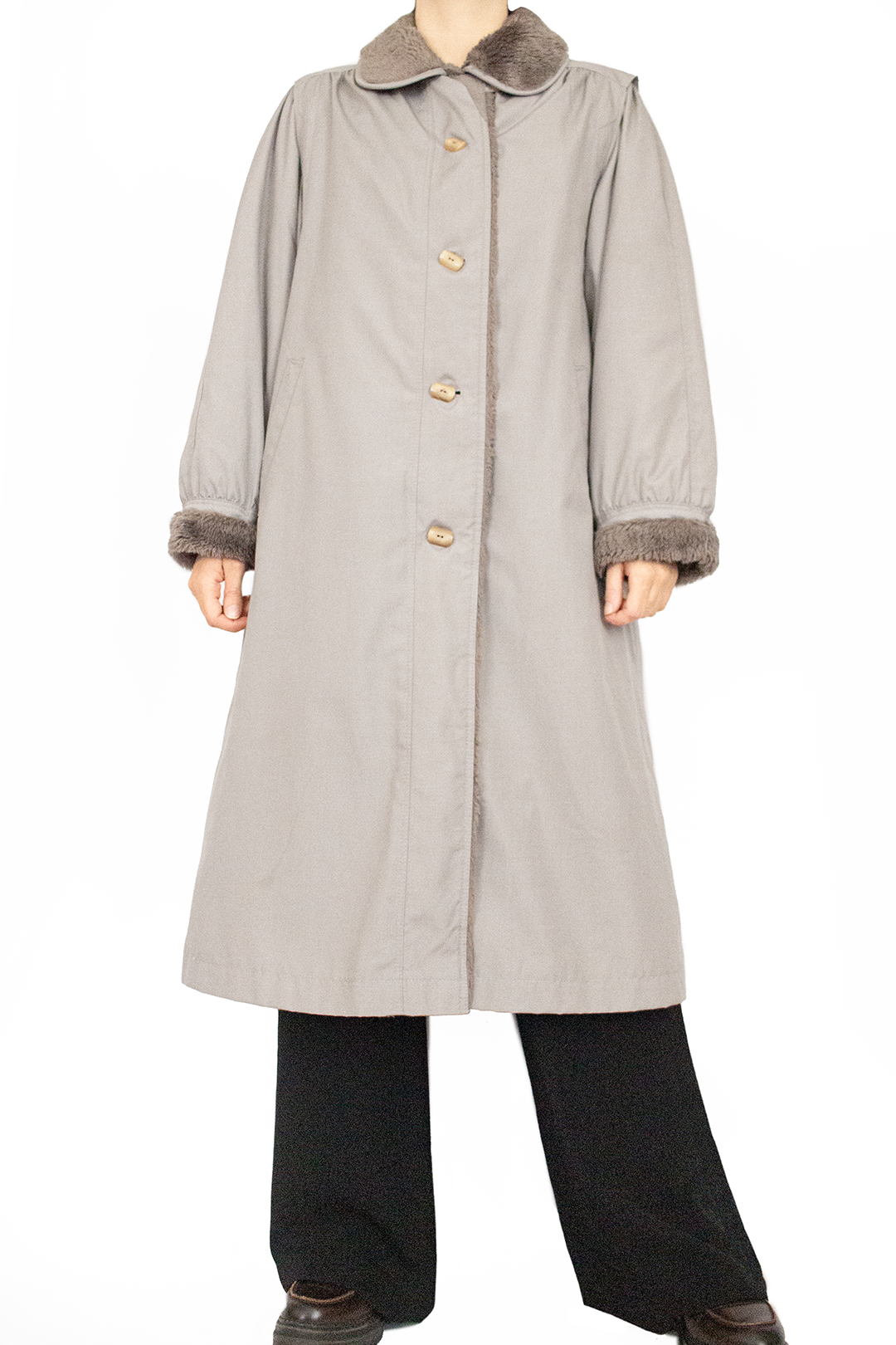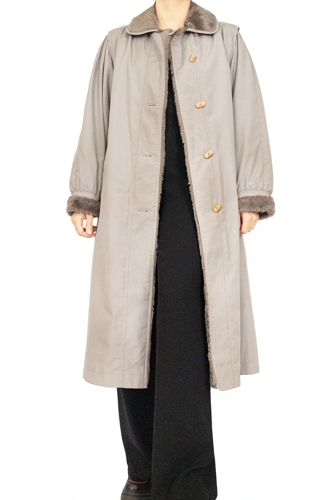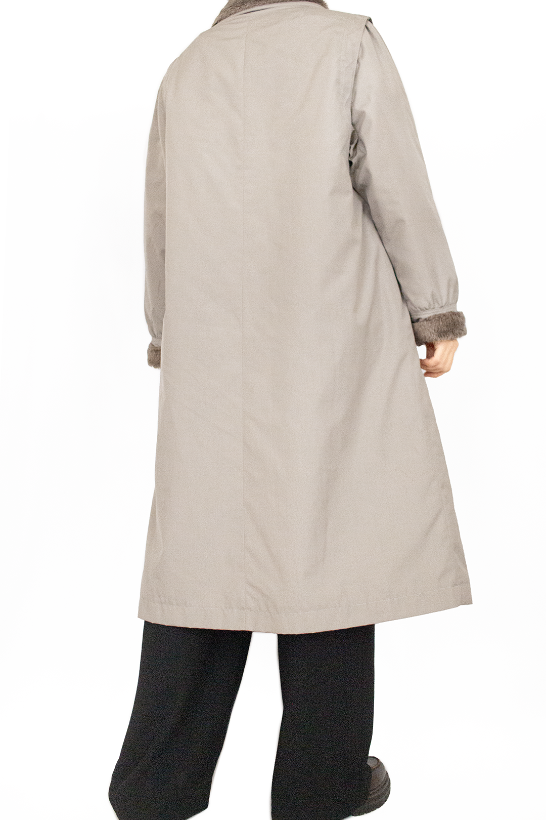 Casaco vintage num tom bege/creme acizentado. Material tipo gabardine mas forrado com pêlo sintético e por isso quentinho. Tamanho M ou mais oversize a tamanhos menores.