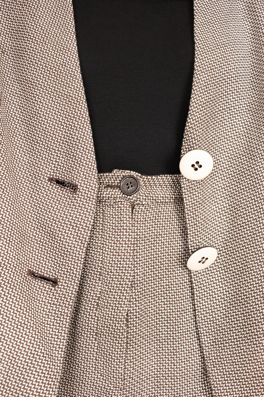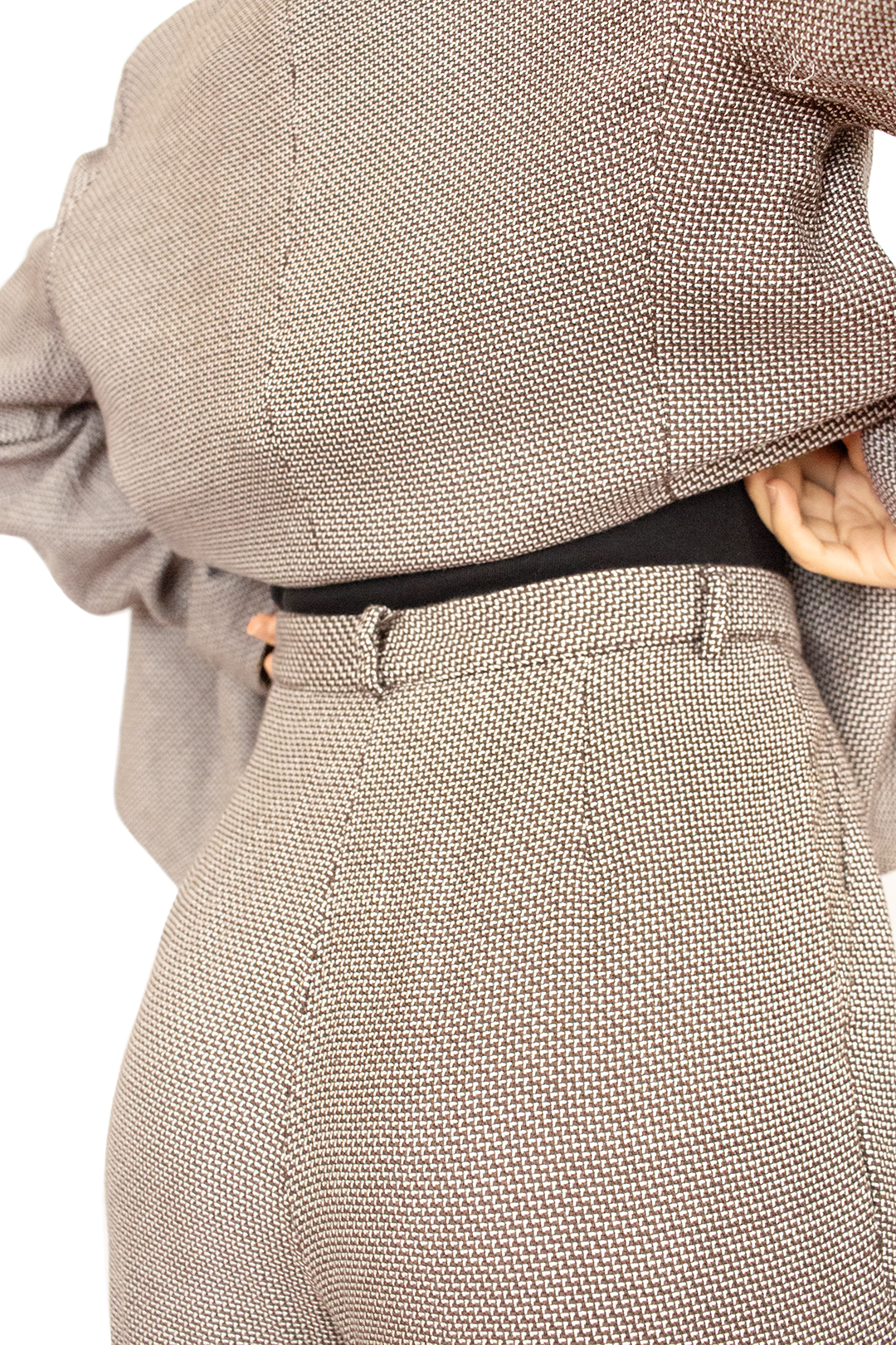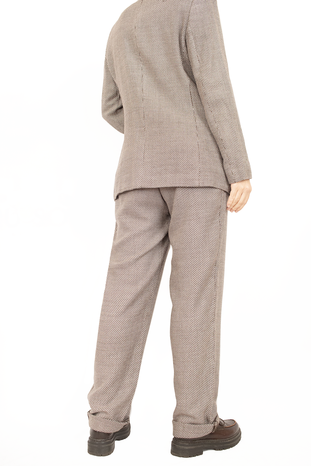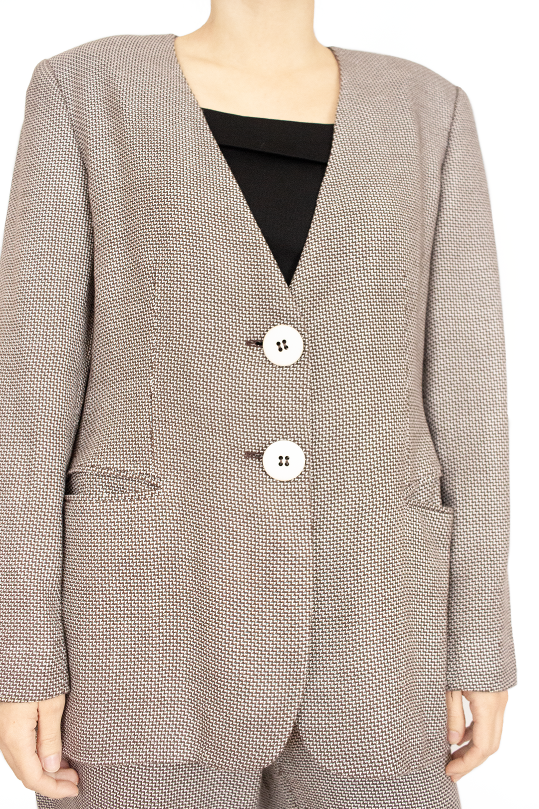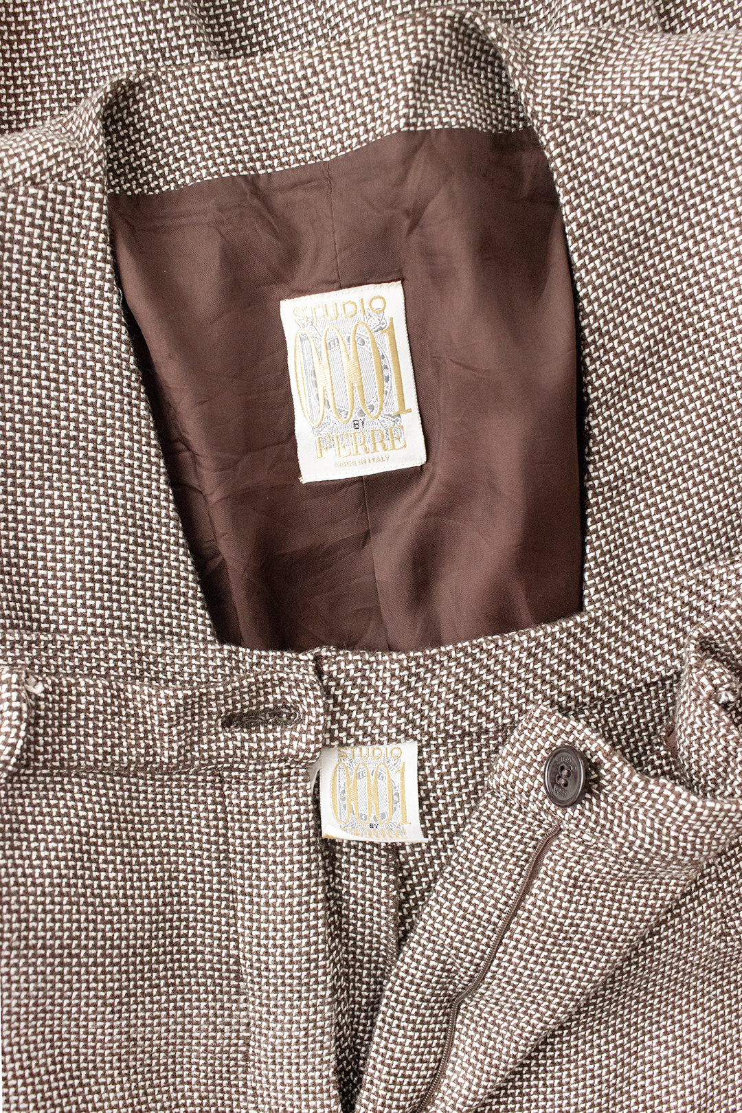 Fato vintage italiano do designer Gianfranco Ferré composto por blazer forrado e calças de cintura subida. Botões grandes. Tom castanho mesclado com creme. Tamanho 40-42. Lã na composição mas sem ser muito grosso. Ótimo estado.