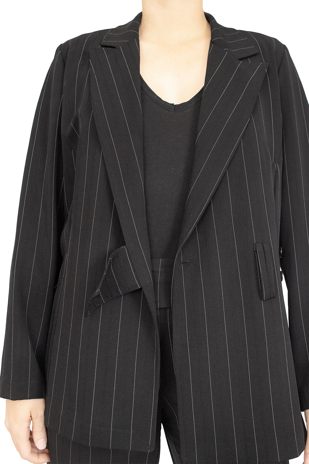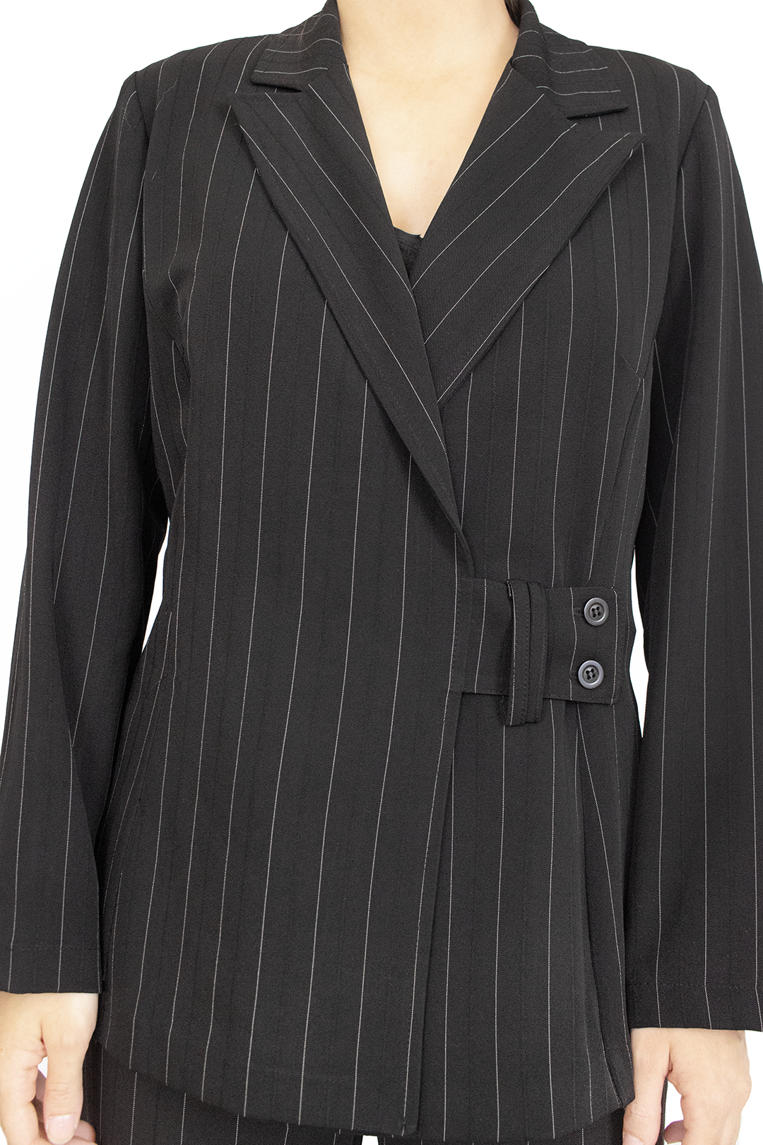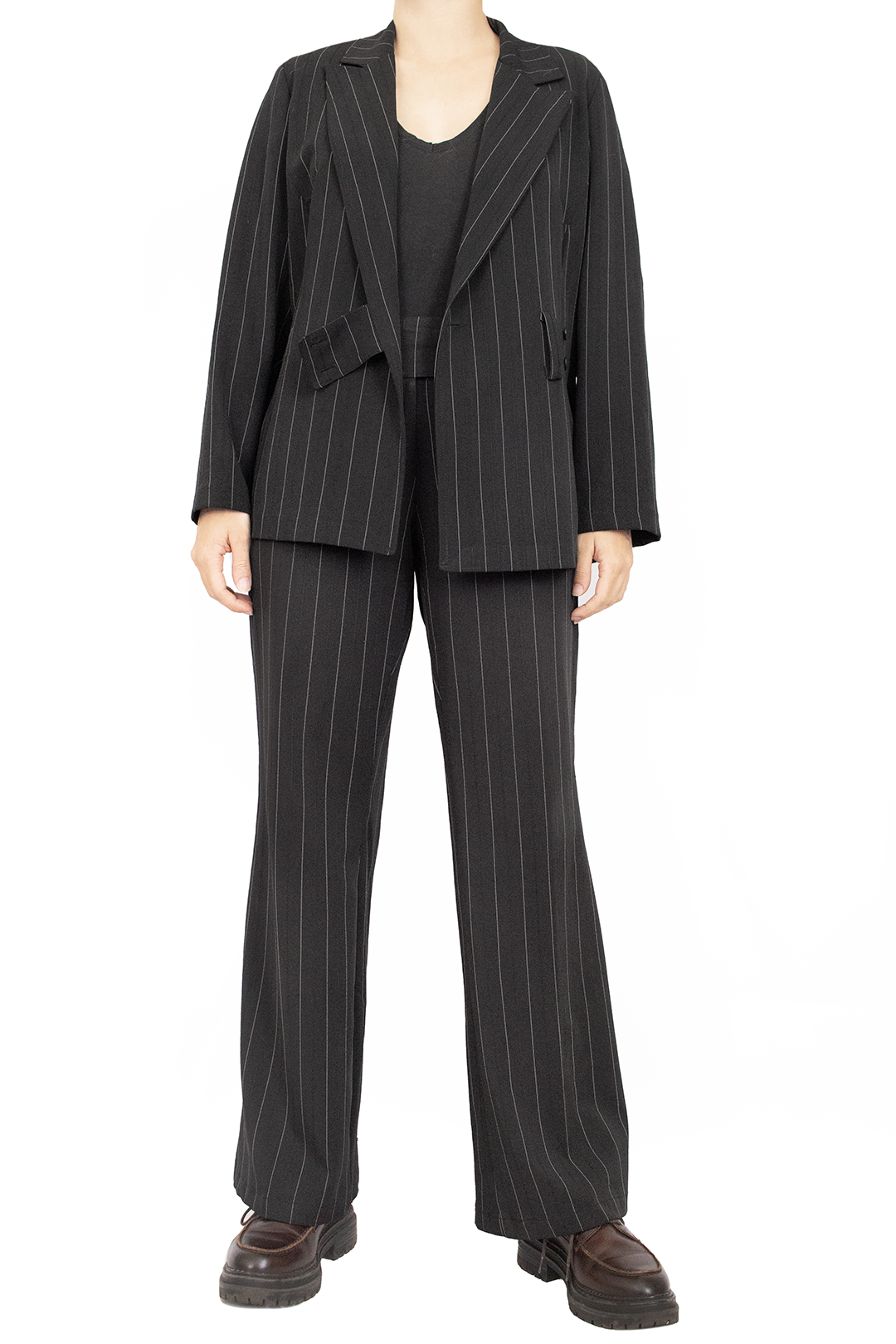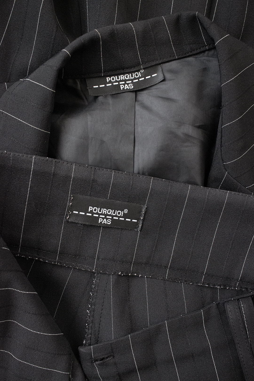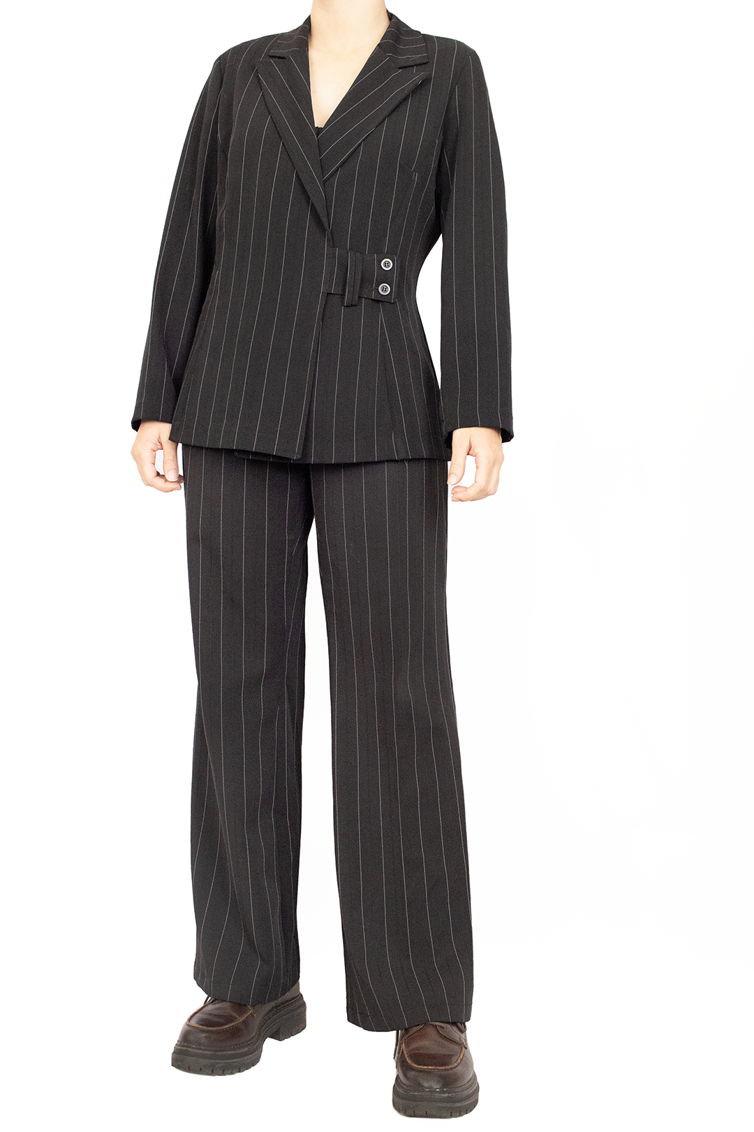 Fato vintage em preto com risca diplomática. Blazer que fecha em trespasse com "fivela". Calças cintura média. Tecido normal de fato, para várias estações. Tamanho 40. Ótimo estado.