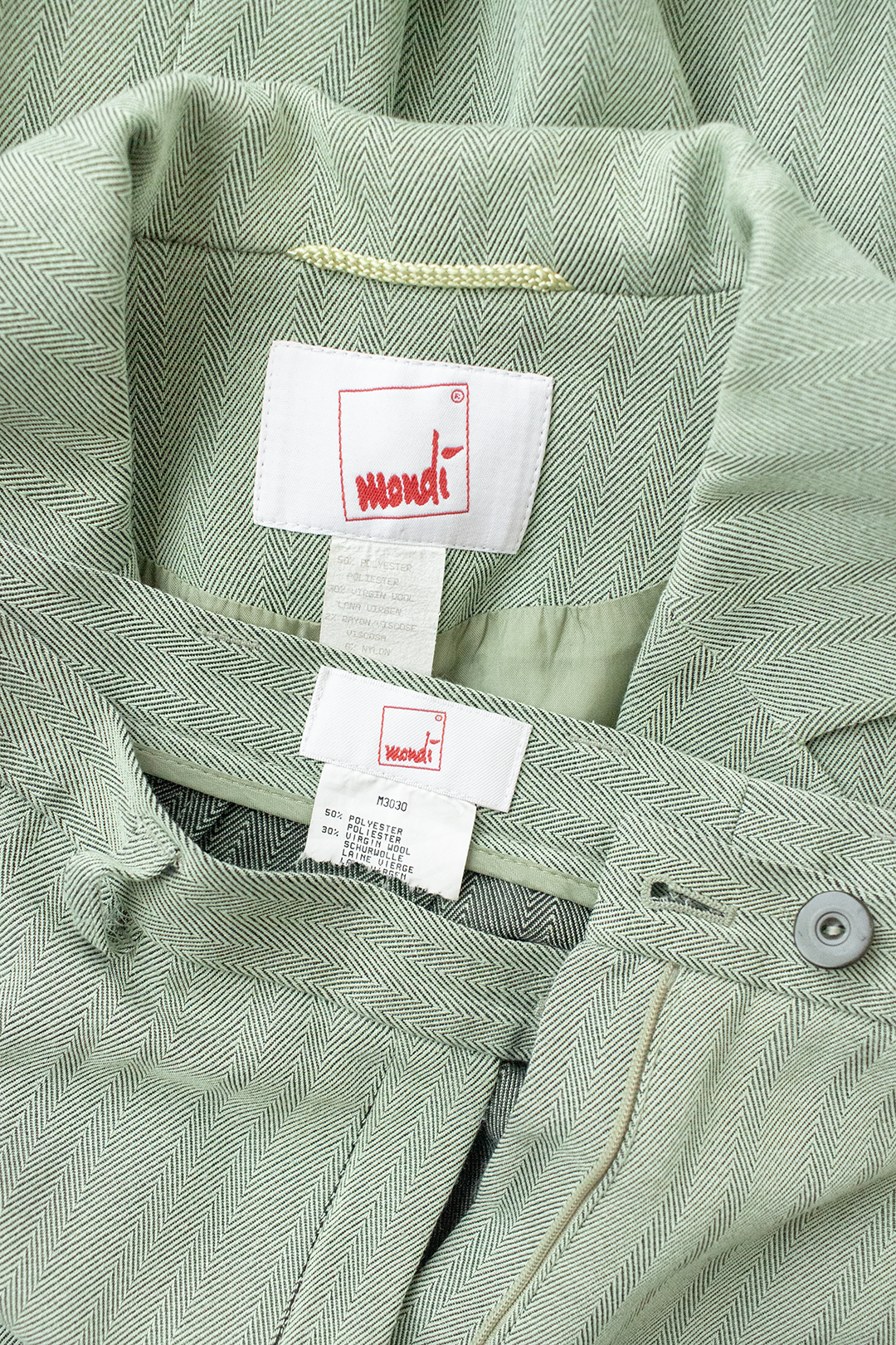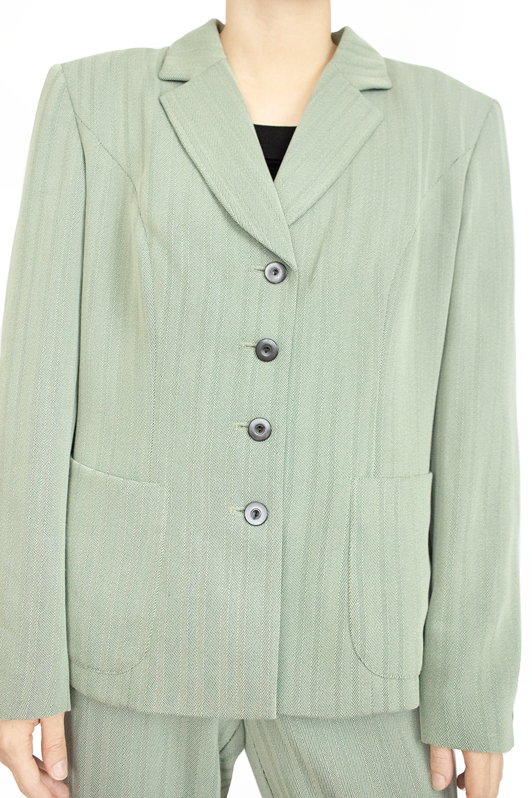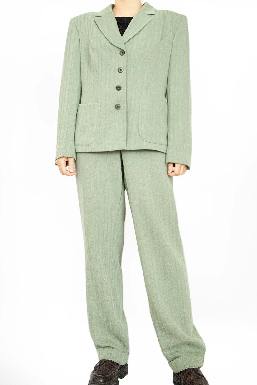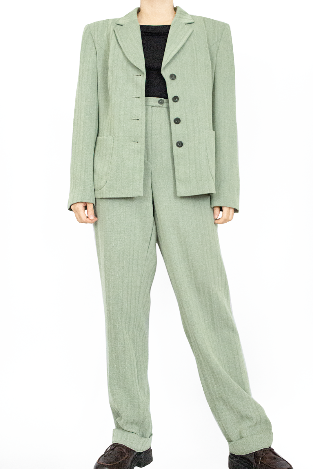 Fato vintage de blazer e calças de cintura subida. Tom verde pistácio espinhado. Tamanho 42-44. Lã na composição mas sem ser grosso. Ótimo estado, ajustado nas imagens. Blazer com ombros mais marcados, com ombreiras.