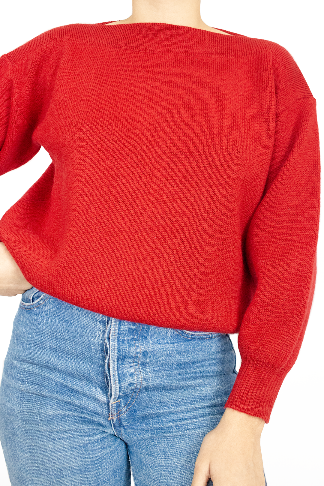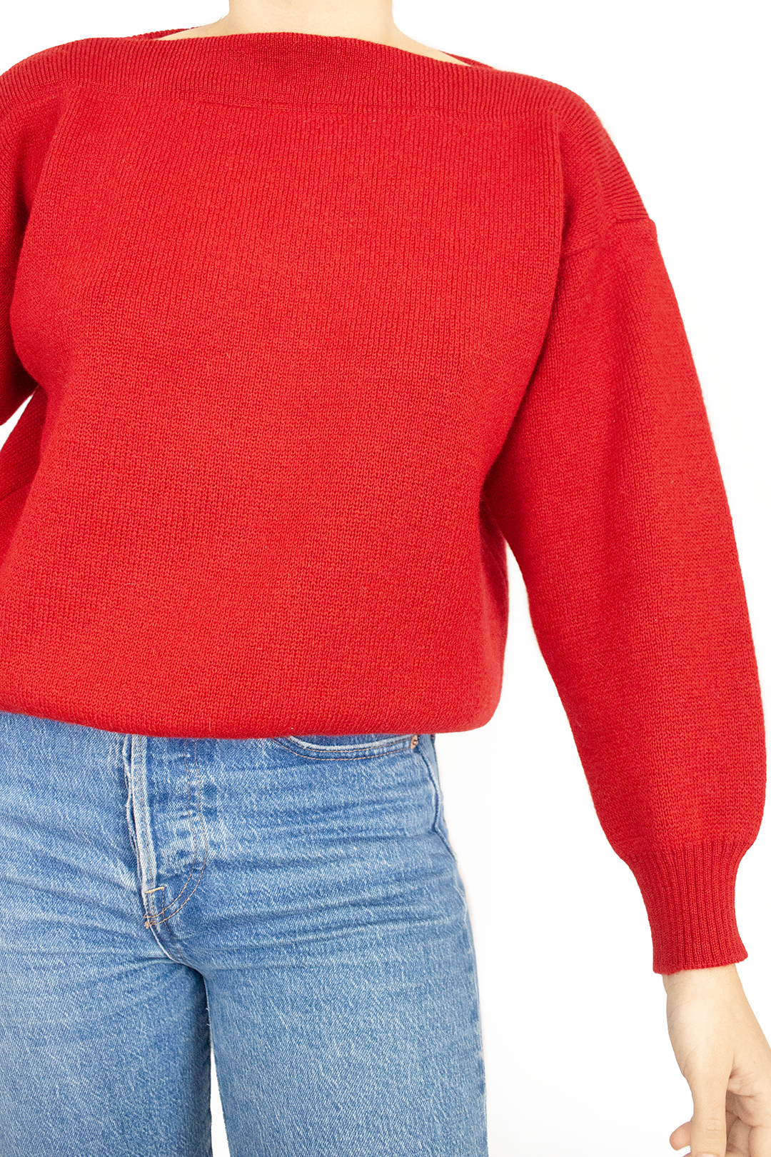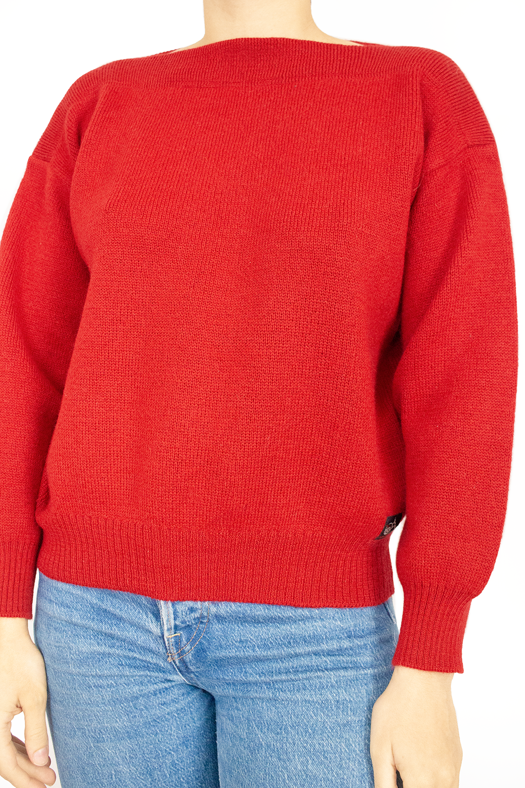 Malha francesa de pura lã, woolmark, em vermelho. Corte ligeiramente em barco nos ombros. Tamanho S. Pica um pouco e por isso aconselhamos usar algo por baixo. Ótimo estado.