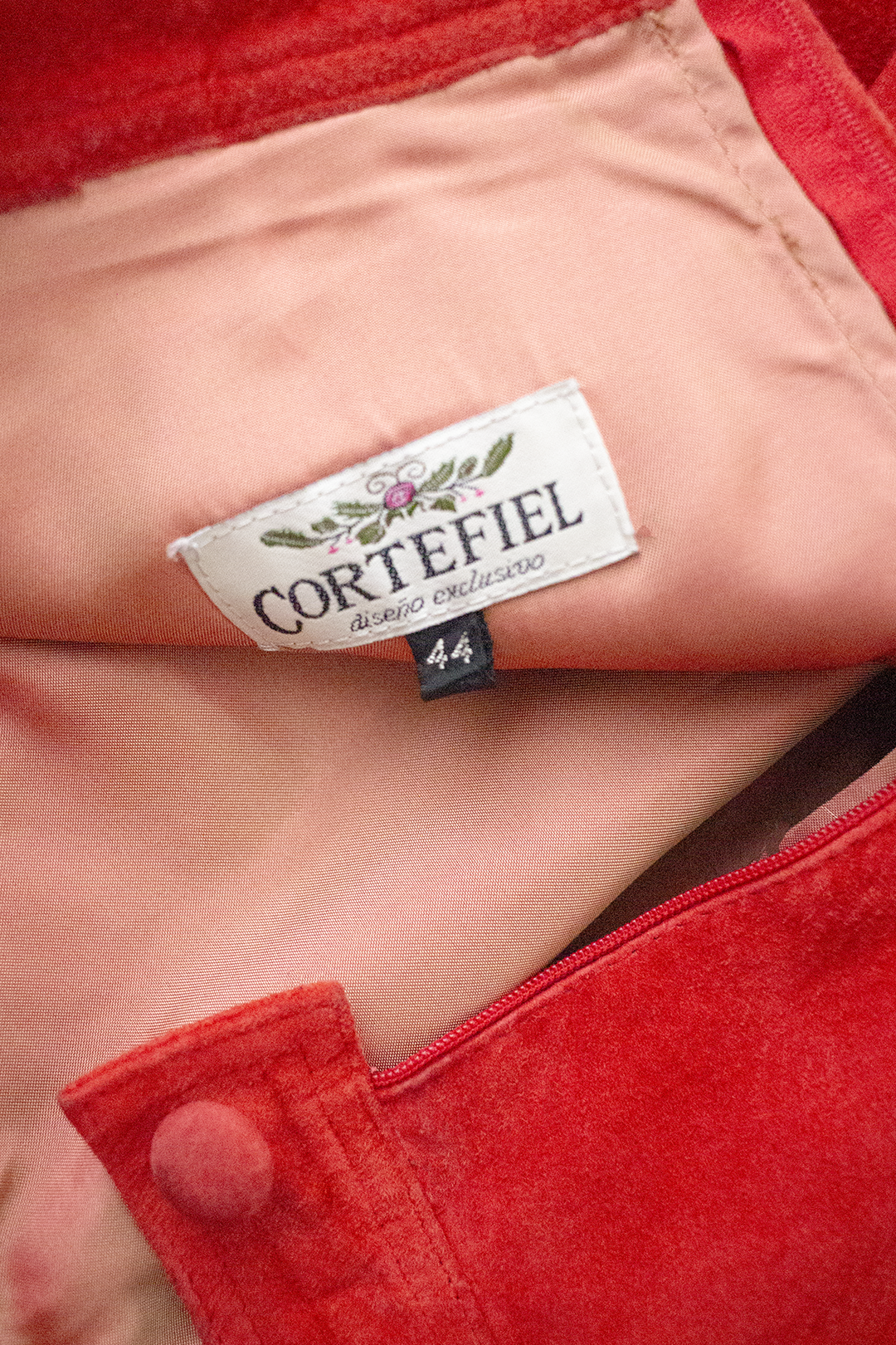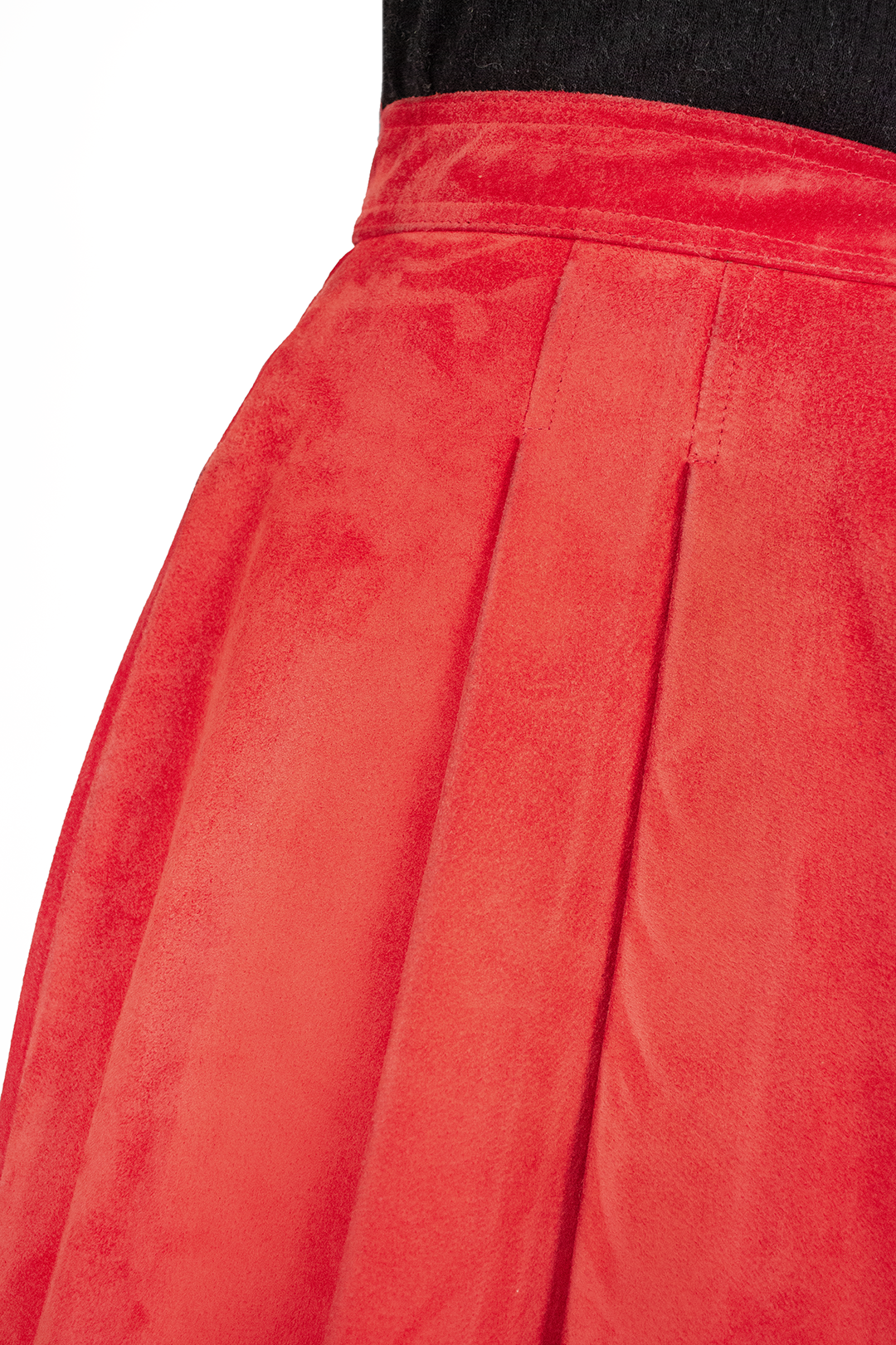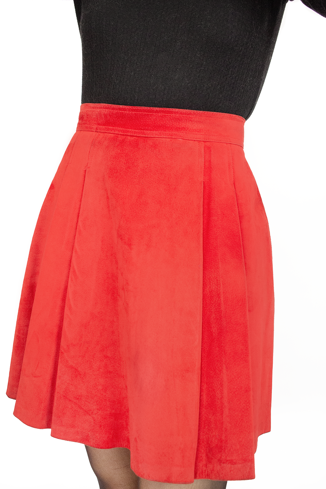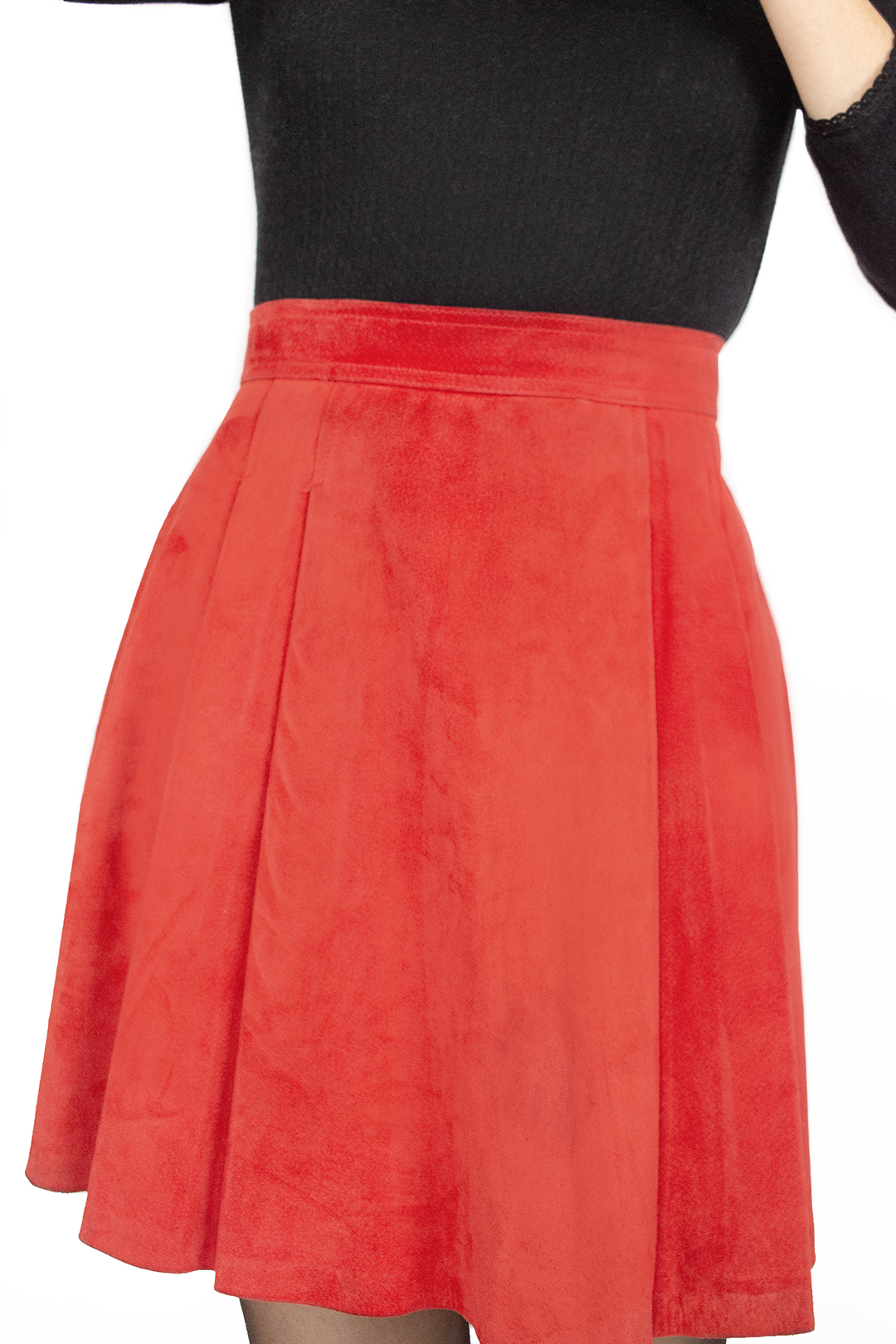 Saia vintage em pele camurça vermelha. Forrada. Corte com pregas, botão e fecho atrás. Tamanho 34-36. Ótimo estado, pequenas imperfeições na pele mas nada evidente.