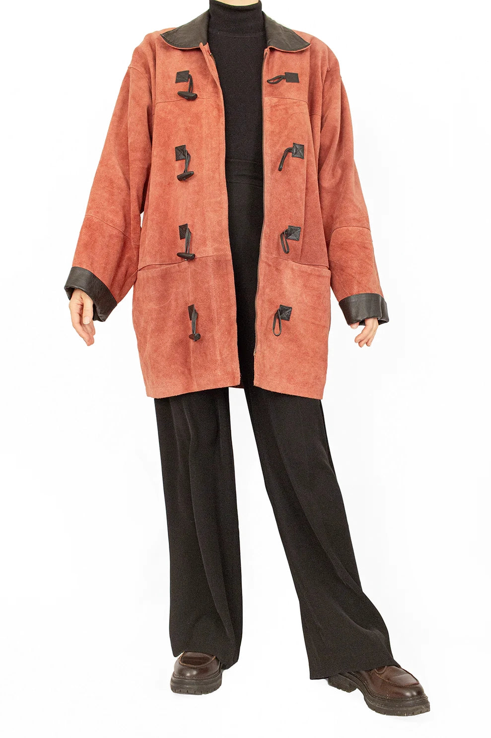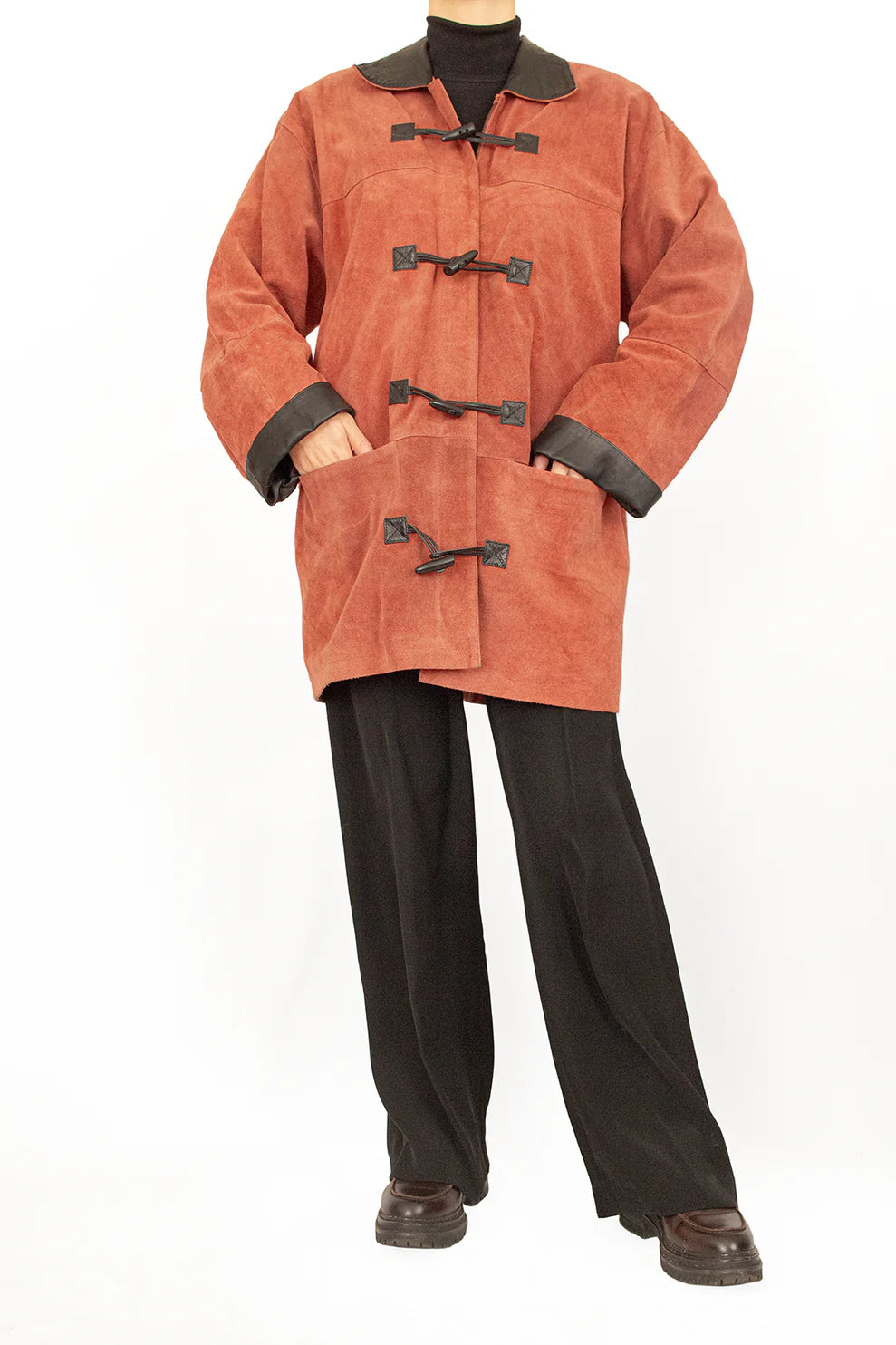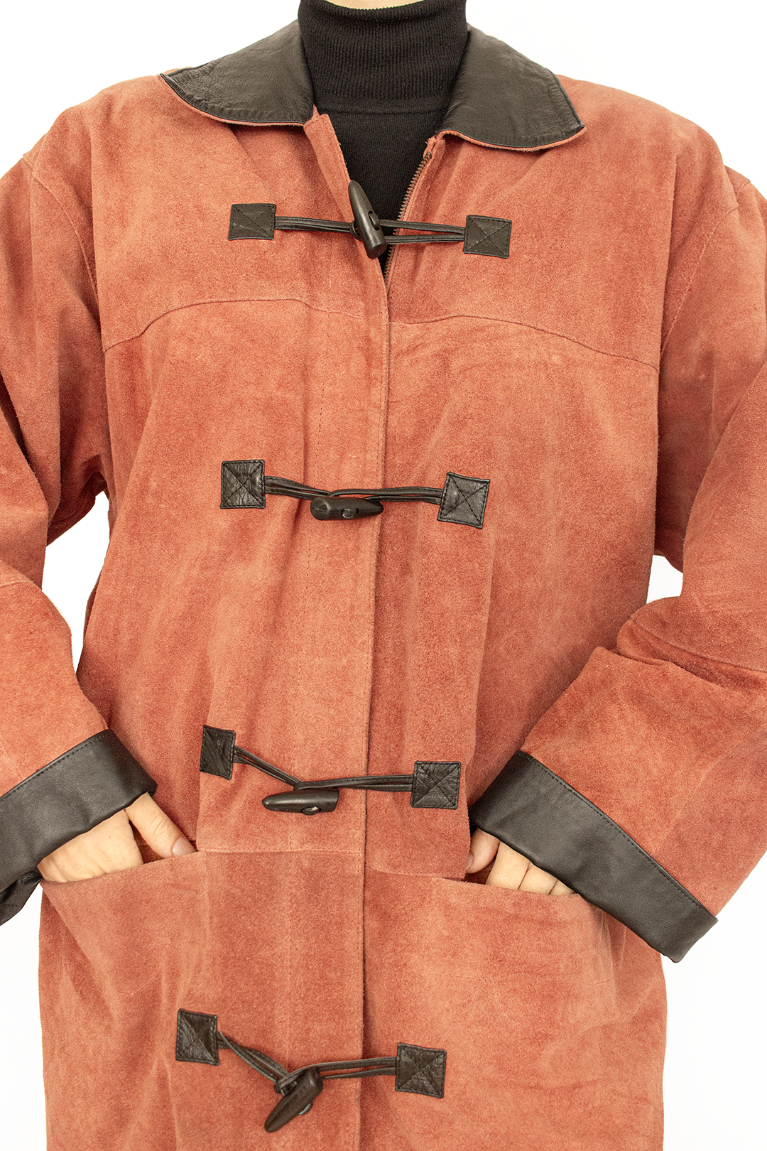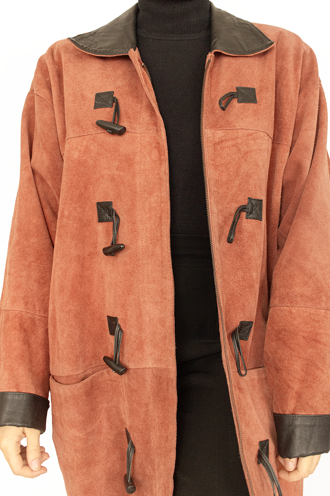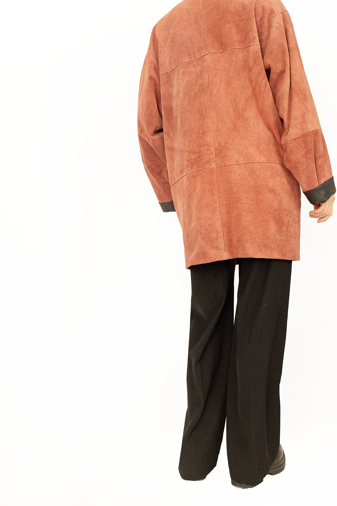 Sobretudo vintage em pele camurça tom alaranjado tijolo com pormenores em pele escura. Pormenores para fechar em preto e fecho. Forrado. Tamanho L ou mais oversize a tamanhos menores. Ótimo estado e qualidade.