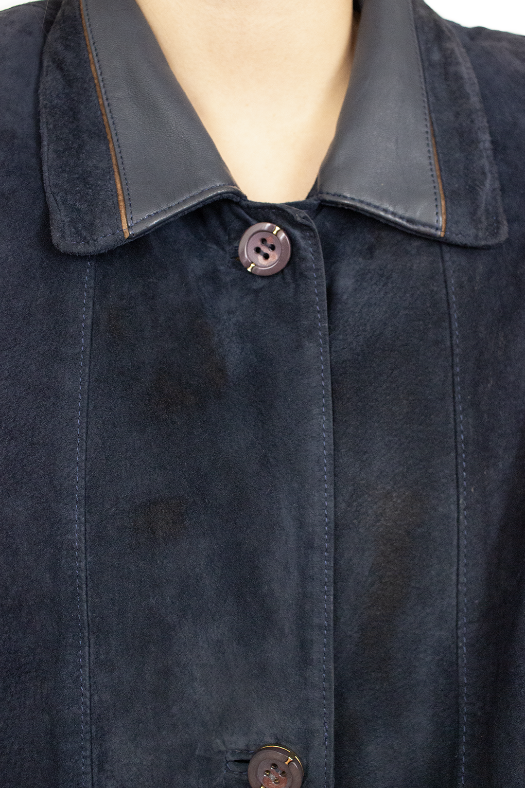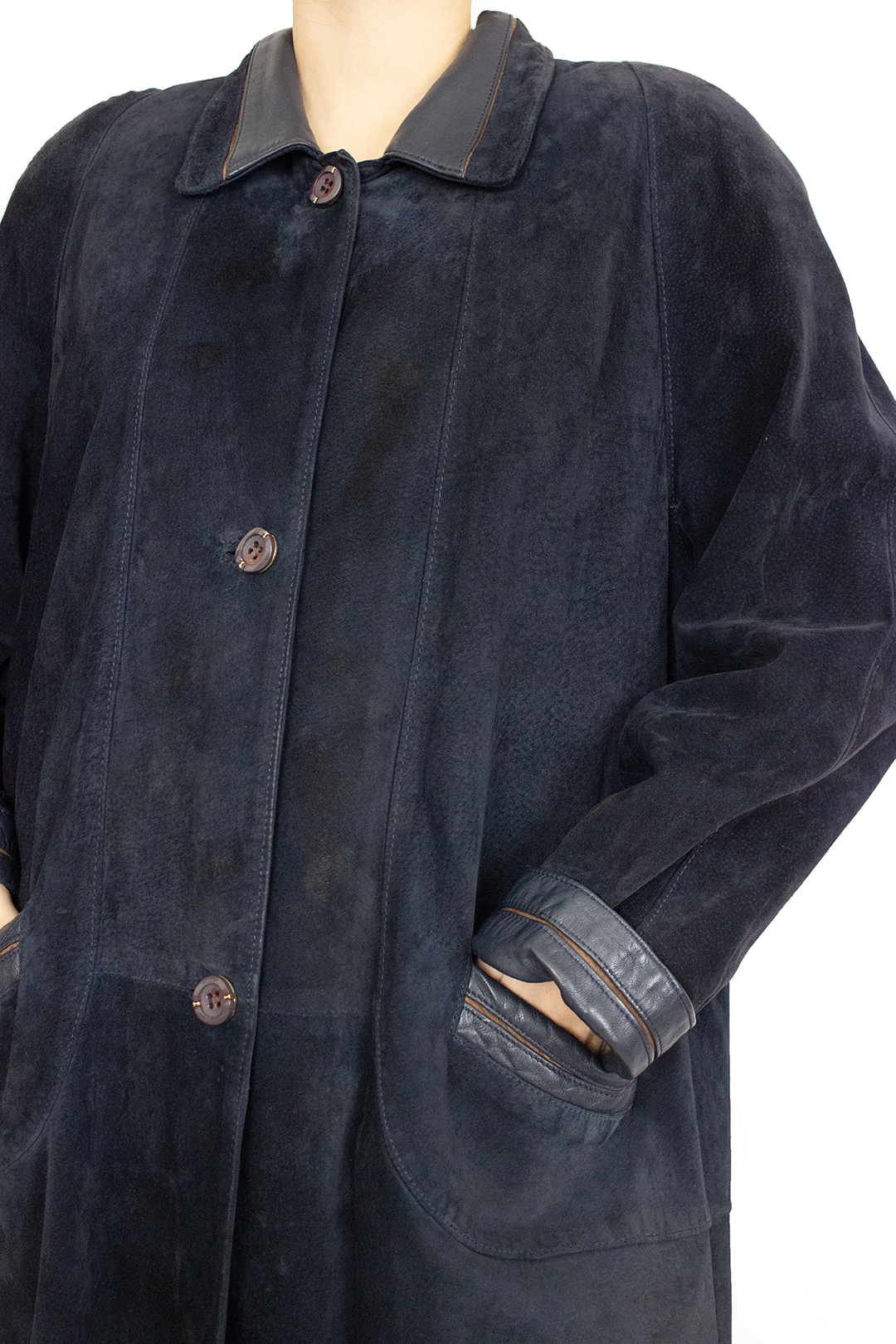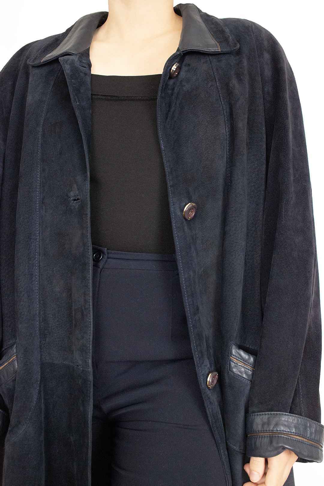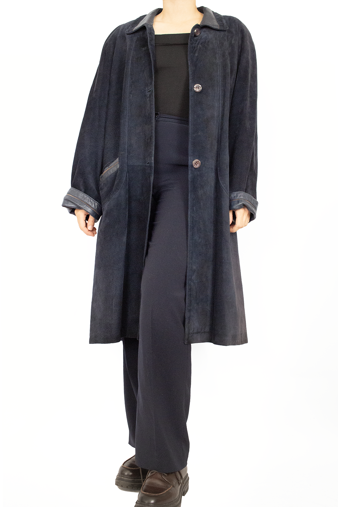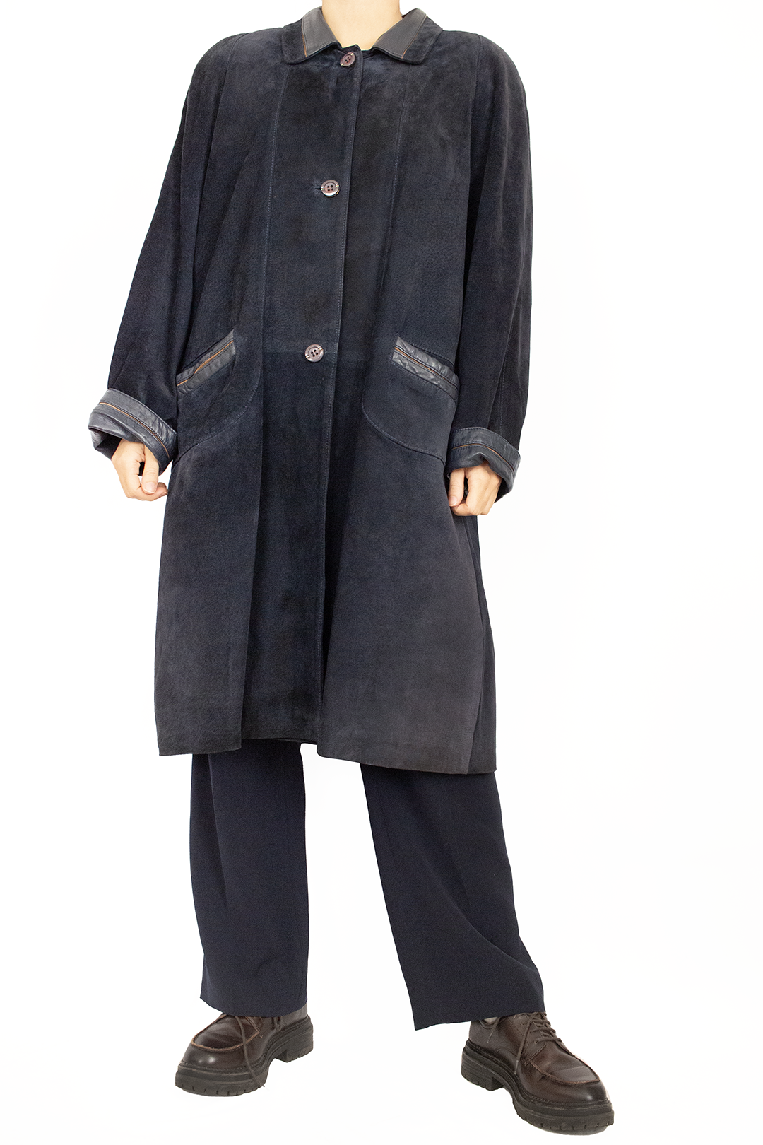 Sobretudo vintage camurça em azul escuro. Pormenores em pele no colarinho, punhos e bolsos com detalhes em castanho. Forrado e com botões bonitos. Tamanho L ou mais oversize a tamanhos menores. Ótimo estado e qualidade.