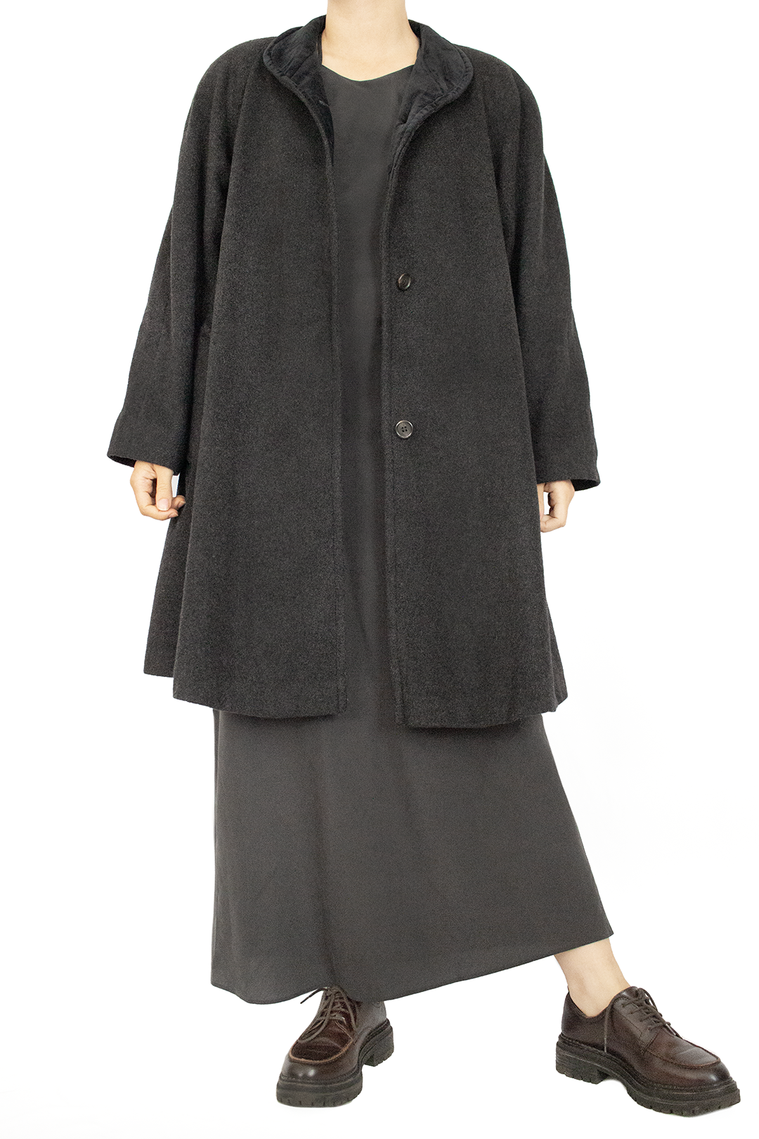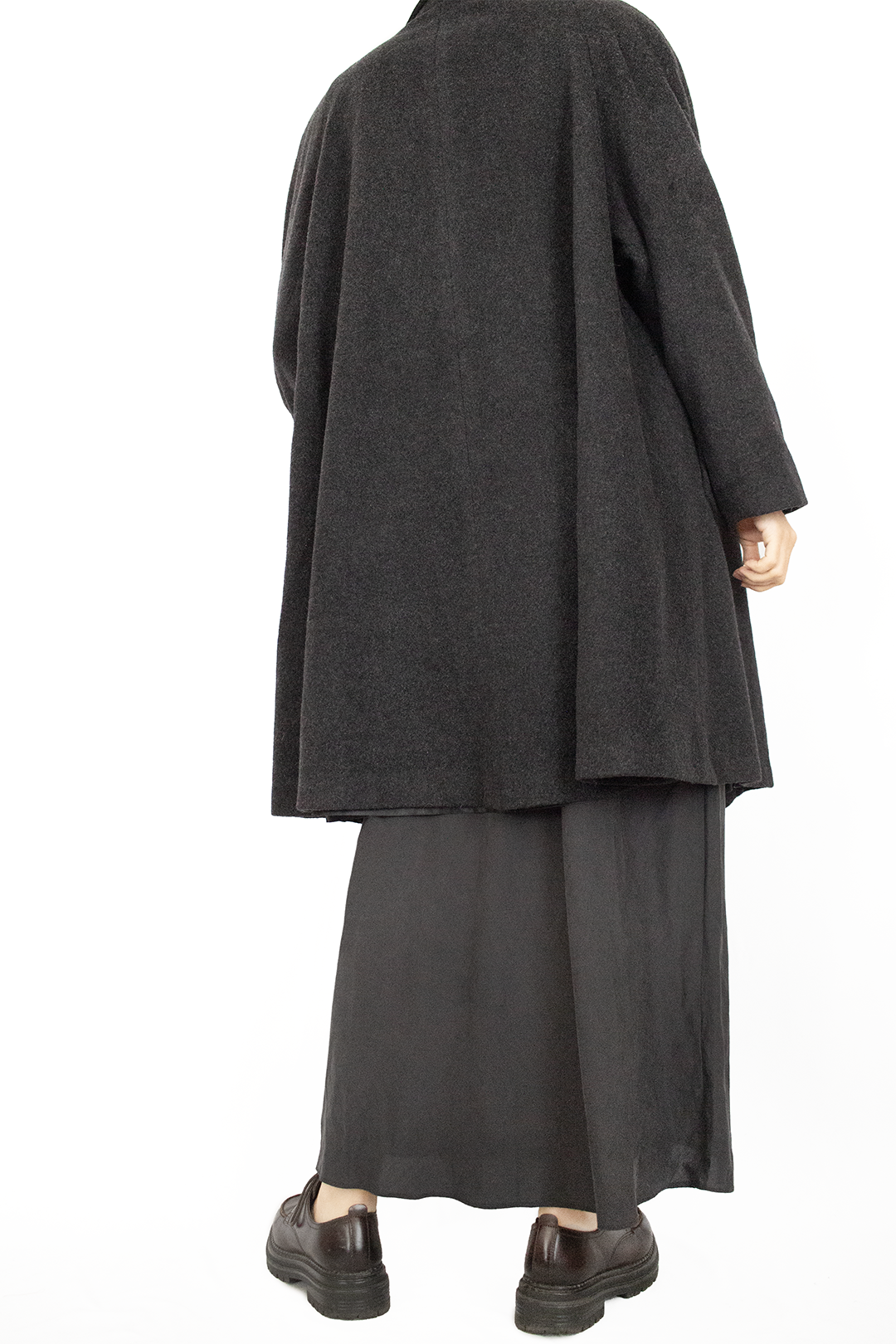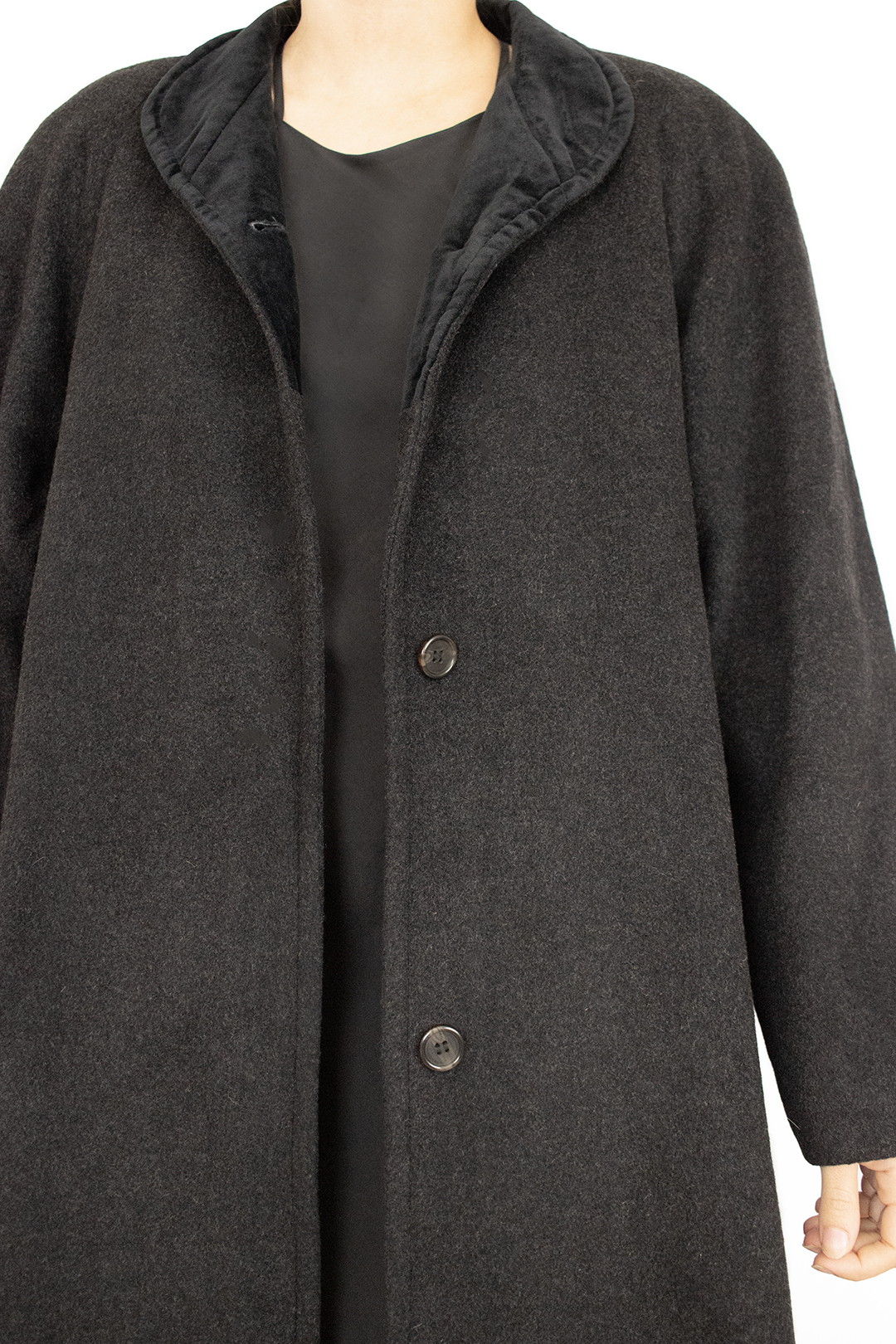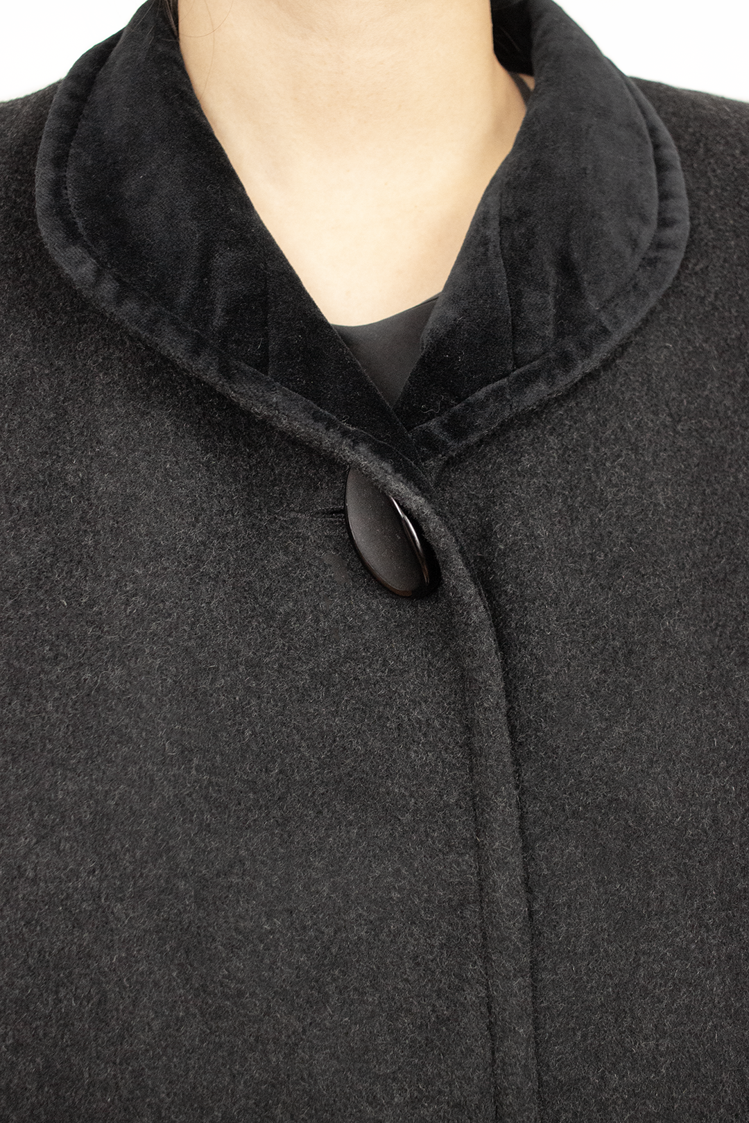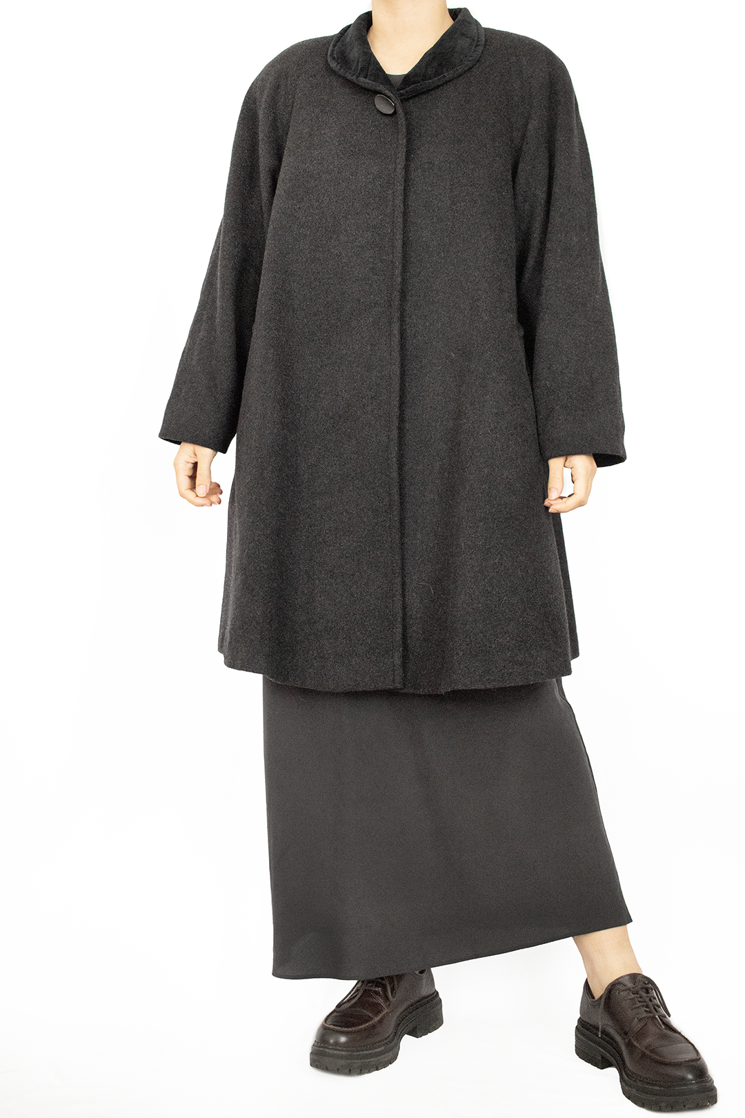 Sobretudo vintage preto-cinza mesclado com gola em veludo. Botões escondidos e botão maior no colarinho. Corte em linha A e com 80% de lã na composição. Tamanho 42 ou mais oversize a tamanhos menores. Ótimo estado.